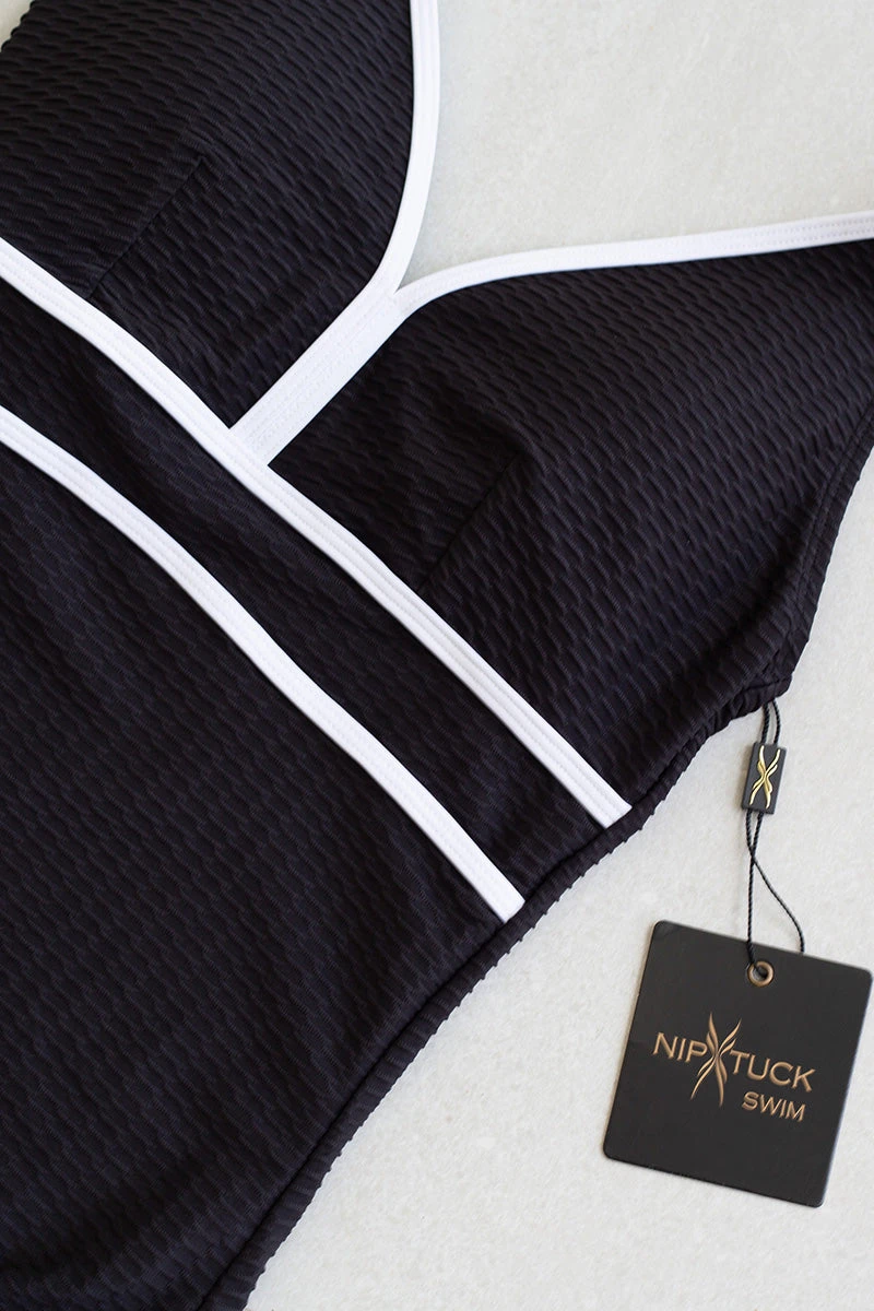 Texture – This swimsuit is made in a beautiful black textured fabric and trimmed with while polyester binds which ensures there will be no cross staining between the colours.Â