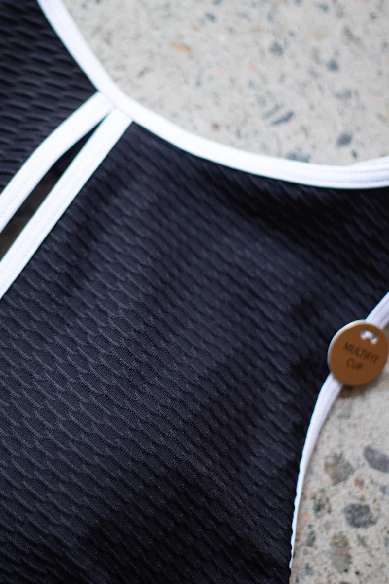 Texture –Â This swimsuit is made in a beautiful black textured fabric and trimmed with while polyester binds which ensures there will be no cross staining between the colours.Â