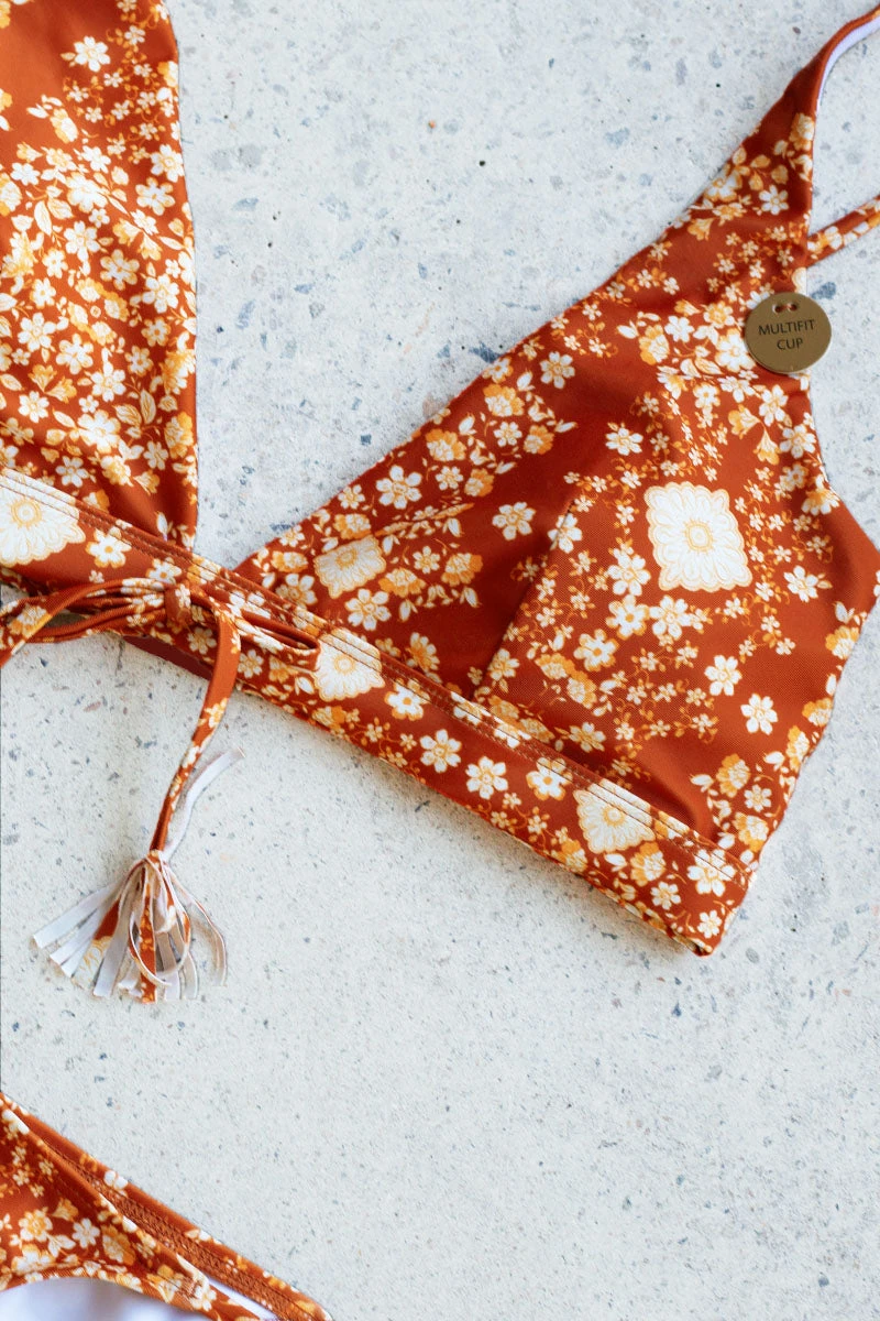 Triangle Shape –Â This bikini features an elongated tri bra with a tassel tie detail. The side seams incorporate boning giving this plunge style the extra support needed to keep you feeling supported. The pant is fastened by dainty tasseled waist ties.Â